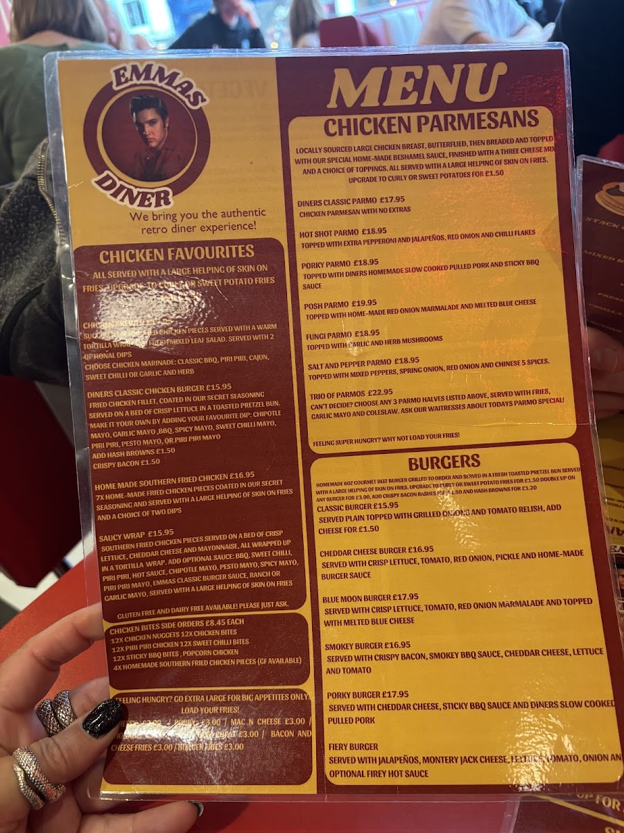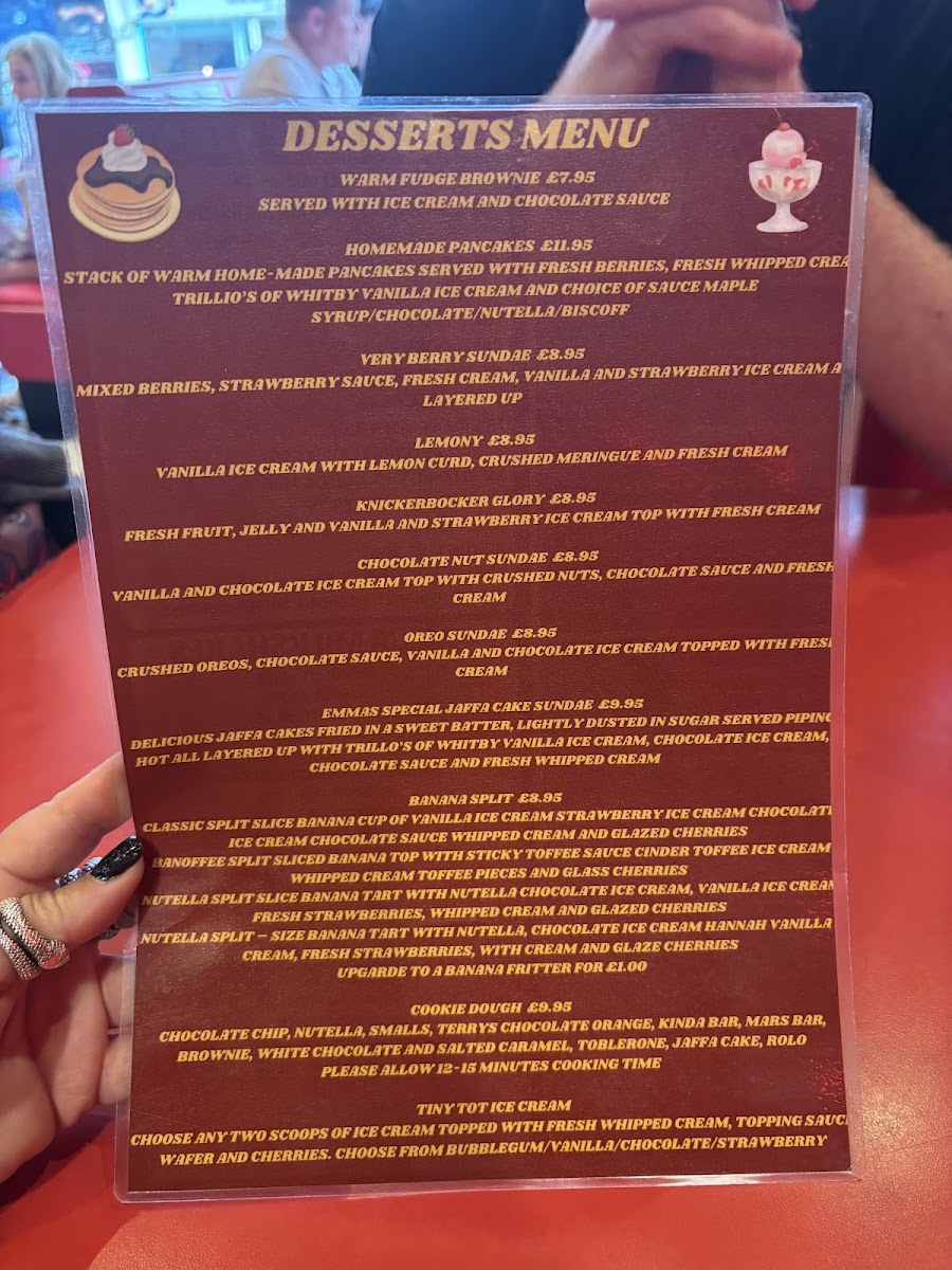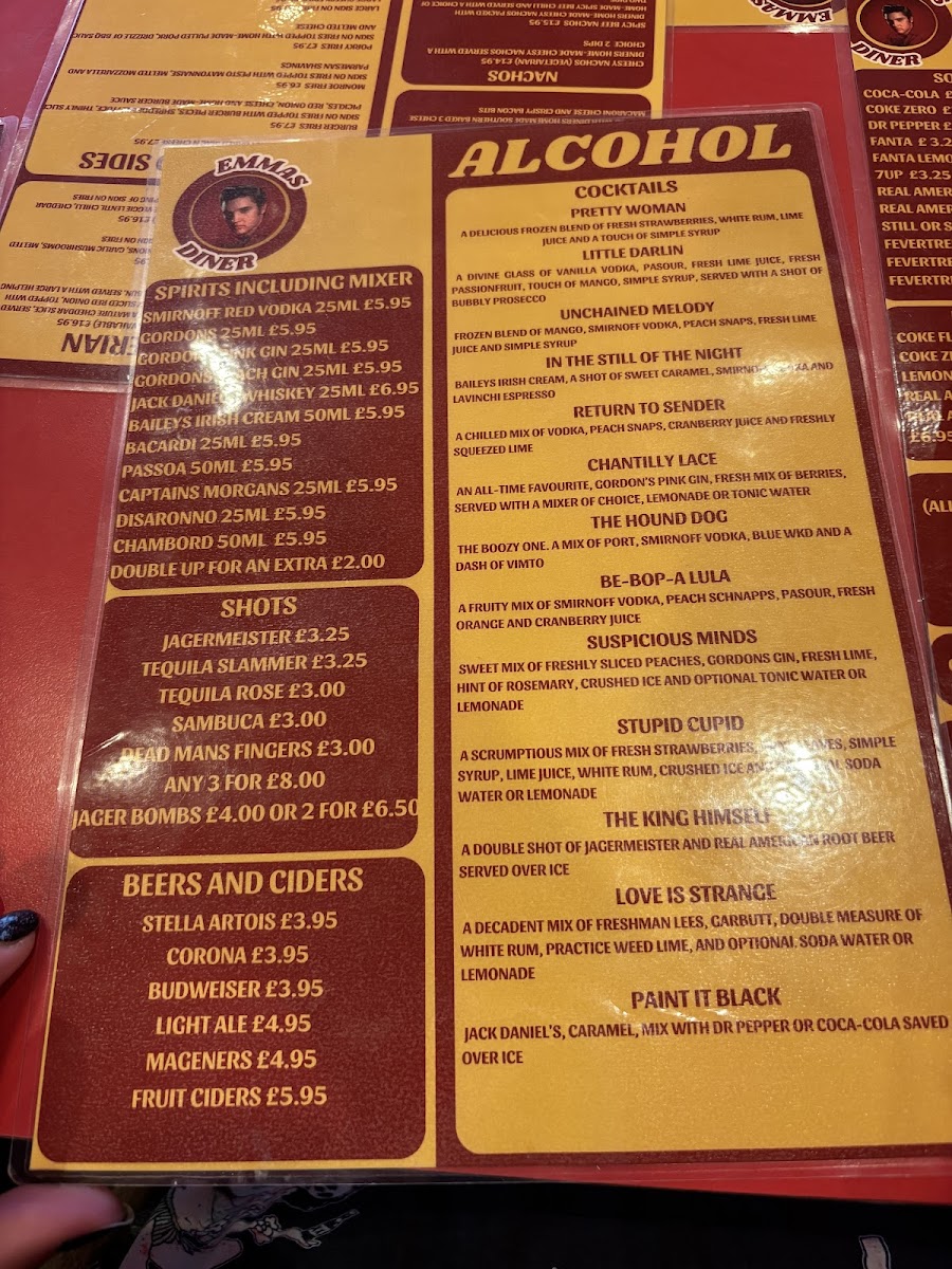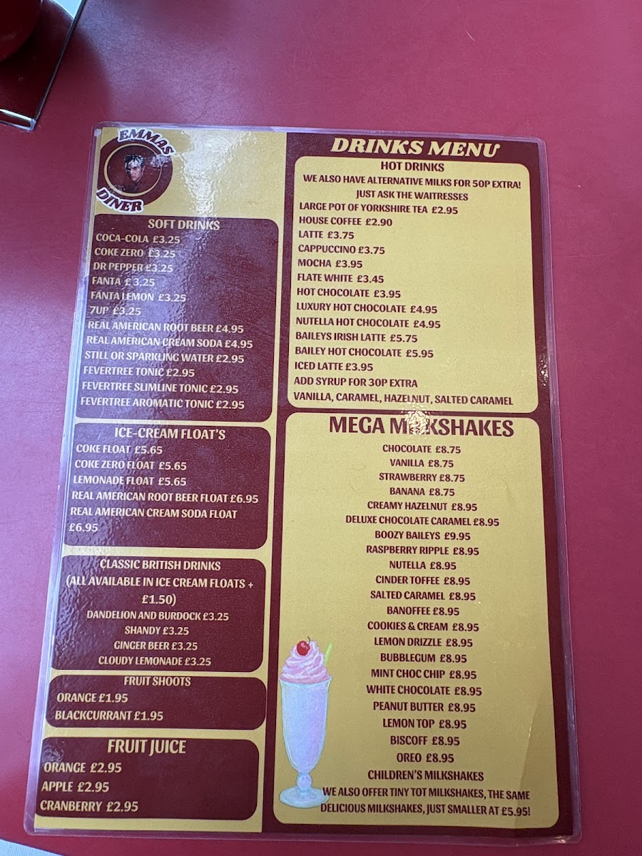 The drink menu draws attention with an array of mega milkshakes, ranging from classic chocolate and vanilla to more adventurous flavours like Boozy Baileys and Cinder Toffee. These creamy, indulgent shakes match the lively diner atmosphere and provide a perfect companion for a comforting meal or a casual catch-up.